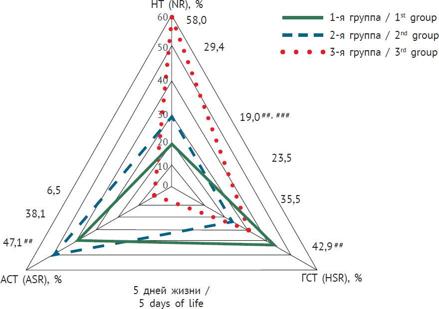 Рис. 1. Вегетативная реактивность у детей трех групп в возрасте 5 дней жизни (%). Статистическая значимость различий (р < 0,05) основной группы в пределах данного типа вегетативной реактивности с показателями: ## группы сравнения; ### группы контроля. НТ — нормальная реактивность, ГСТ — гиперсимпатикотоническая реактивность, АСТ — асимпатикотоническая реактивность