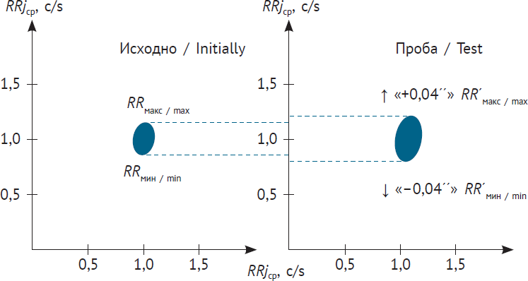 Наглядный пример вегетативного обеспечения сердечной деятельности с дезадаптацией за счет низкой реактивности обоих отделов ВНС представлен на рис. 4. Из рисунка видно, что исходно по КРГ определяется ваготонический тип вегетативной регуляции (RRср = 1,1 с). При дыхательной пробе отмечается недостаточная реакция парасимпатического отдела ВНС, поскольку исходно значение интервала RRмакс = 1,16 с, при дыхательной пробе интервал RR’макс = 1,2 с, то есть произошло увеличение RR’макс только на 0,04 с (при норме 0,05–0,10 с). Это отражает недостаточную реактивность парасимпатического отдела ВНС на функциональную пробу. Исходно значение интервала RRмин = 0,77 с, а при дыхательной пробе интервал RR’мин = 0,73 с, то есть он уменьшился на 0,04 с (при норме 0,05–0,10 с). Эти изменения свидетельствуют о вегетативной дисфункции с низкой реактивностью симпатического отдела ВНС на функциональную пробу.