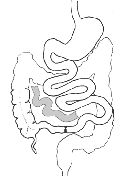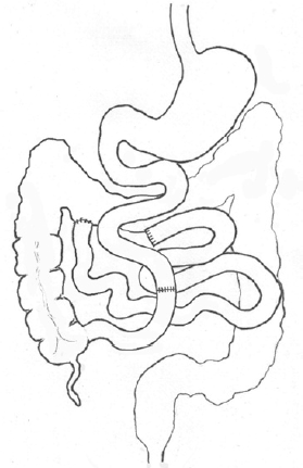 Изучение эффектов и поиск оптимального варианта еюноилеального шунтирования стали основным направлением хирургии ожирения почти на два десятилетия. В начале 60-х гг. XX в. хирург Джон Пэйн и эндокринолог Лорен де Винд (John Payne, Loren DeWind) из университета Южной Калифорнии (США) опубликовали серию наблюдений пациентов, которым накладывали соустье между проксимальным отрезком (длиной 38–51 см) тонкой кишки и поперечно-ободочной кишкой. Дистальная часть тонкой кишки заглушалась. Методика оказалась эффективной, однако развивавшиеся тяжелые метаболические нарушения вследствие изнурительных поносов потребовали трансформации процедуры в еюноилеальное шунтирование [73] (рис. 7, 8).