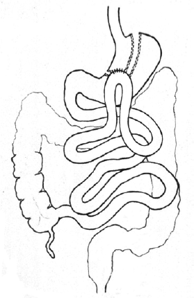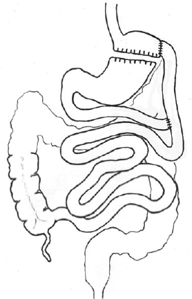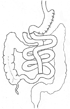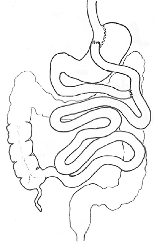 Неудовлетворенность большим количеством побочных эффектов еюноилеального шунтирования послужила основанием для поиска более безопасных методик хирургического лечения ожирения. В 1966 г. американским хирургом Эдвардом Мэйсоном (Edward Mason) из университета Айовы после продолжительных лабораторных экспериментов (совместно с Чикаши Ито, Chikashi Ito) женщине 50 лет была выполнена операция, получившая в литературе название «желудочное шунтирование» (gastric bypass, GB). Идея была позаимствована из методики резекции желудка по Billroth II (с наложением гастроеюнального анастомоза на Ω-петле), широко применявшейся при язвенной болезни [63] (рис. 15, 16).