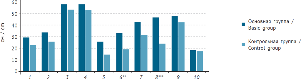 Fig. 2. Results of the Study of Interpersonal Distance: 1 – female friend; 2 – friend; 3 – unknown man; 4 – unknown woman; 5 – husband; 6 – mother; 7 – father; 8 – siblings; 9 – doctor; 10 – child; indicator of significance of differences: ** (р < 0,01), *** (р < 0,001)