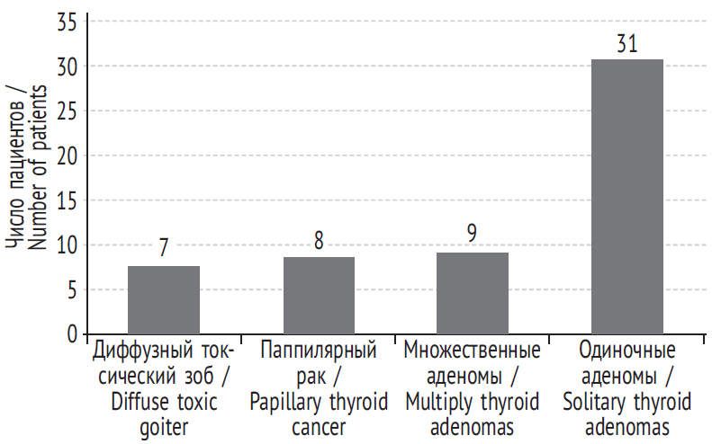 Возраст детей в исследуемой группе составил от 3 до 17 лет, в среднем 15 ± 1,2 года. Мальчиков — 12 (21,8 %), девочек — 43 (78,2 %), соотношение 1 : 5. Папиллярный рак ЩЖ являлся причиной операций у 8 (14,6 %) детей. В 31 (56,3 %) случае хирургические вмешательства выполнены по поводу одиночных аденом. Множественные аденомы выявлены в 9 (16,4 %) наблюдениях. У 7 (12,7 %) детей хирургическое лечение выполнено по поводу диффузного токсического зоба (рис. 6).