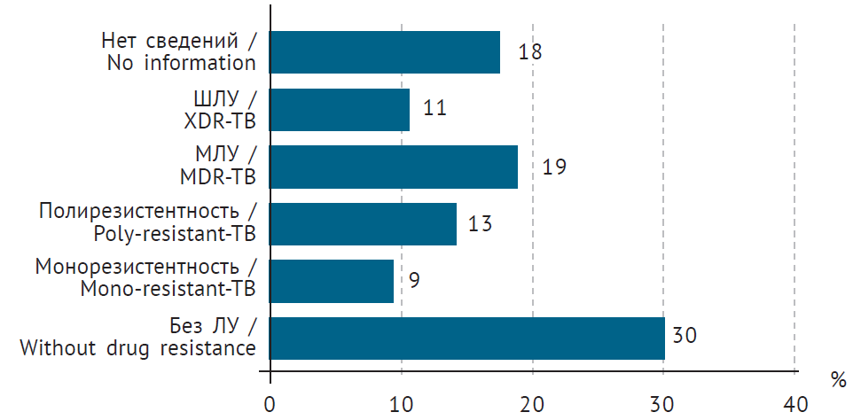 Рис. 1. Варианты чувствительности микобактерий туберкулеза к противотуберкулезным препаратам у источника заражения детей (МЛУ — множественная лекарственная устойчивость; ШЛУ — широкая лекарственная устойчивость; ЛУ — лекарственная устойчивость)