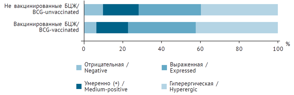Рис. 2. Результаты пробы Манту с 2 ТЕ у вакцинированных и не вакцинированных БЦЖ детей