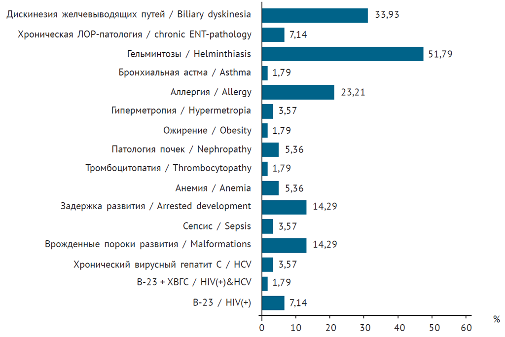 Не связанную с туберкулезом сопутствующую патологию имели 56 % детей, нередко сочетанную. По частоте среди таких состояний (рис. 4) лидировали гельминтозы (51,8 %), дискинезия желчевыводящих путей (33,9 %) и аллергические заболевания (23,2 %). В прогностическом отношении важными являются диагнозы ВИЧ-инфекции (В-23) у 4 детей, хронический вирусный гепатит С — у двоих, сочетание В-23 и ВГС — у одного, септические состояния — у двоих, бронхиальная астма — у одного.