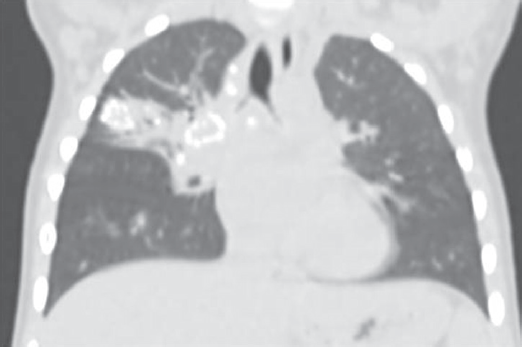 Fig. 6. Chest computed tomography scan of the 2-years old boy (Ghon's complex)