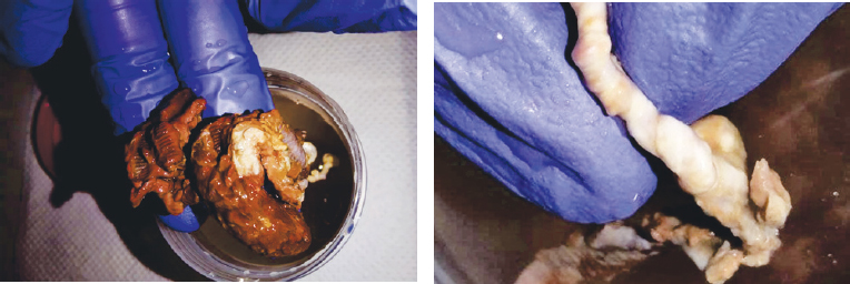 Рис. 4. Извлеченный препарат (фрагменты некротизированной ткани левых придатков матки вследствие перекрута) / Fig. 4. Biopsy (fragments of necrotized tissue of left uterine adnexa due to torsion)