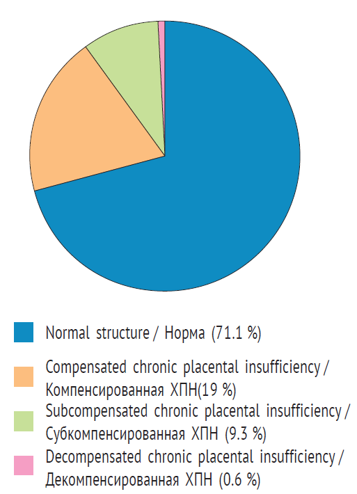 Hence, the condition of the newborn is affected not solely and not so much by placental insufficiency but also by the pathological process stage. In this case, compensated placental insufficiency should be considered as an acceptable structure of the placenta with the implementation of compensatory-adaptive mechanisms on the part of the mother, foetus and placenta. Thus, for effective pregnancy and childbirth management, it is essential to develop criteria, in particular those based on ultrasound results, for the timely identification of subcompensated and decompensated stages of placental insufficiency during pregnancy.