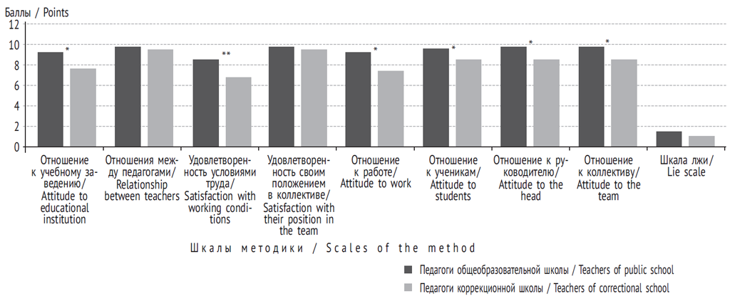 Педагоги общеобразовательной школы отличаются большей благосклонностью к своим ученикам, общение с которыми их стимулирует, понимают, что учебным результатам могут помешать их личные проблемы, с удовольствием принимают участие в культурно-массовых мероприятиях вместе с подопечными. Педагоги коррекционной школы чаще отмечают утомление от общения с учениками (p ≤ 0,05). Достоверные различия по шкалам «отношение к руководителю» и «отношение к коллективу» (p ≤ 0,05) характеризуют наличие проблем педагогов коррекционной школы: недостаточную поддержку руководства, коллег, субъективно недостаточное понимание, а также напряженные взаимоотношения с коллективом. Наиболее существенные различия отмечаются по шкале «удовлетворенность условиями труда» (p ≤ 0,01). Испытуемые отмечают неудовлетворенность как учебно-методическими, так и режимными, а также организационно-бытовыми аспектами рабочей обстановки. При этом отсутствие значимых различий и нормативность показателей шкал «отношение между педагогами», «удовлетворенность своим положением в коллективе», «шкала лжи» характеризует позитивное восприятие отношений «по горизонтали» и достоверность полученных данных.