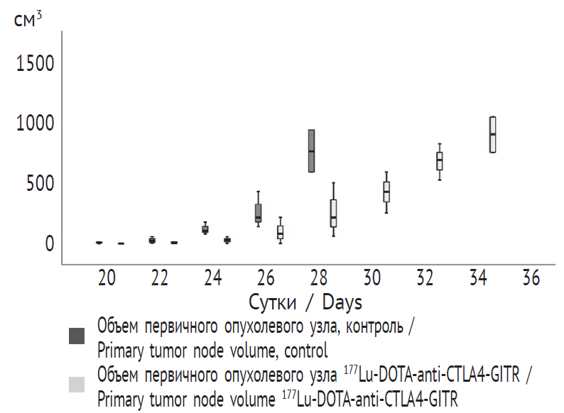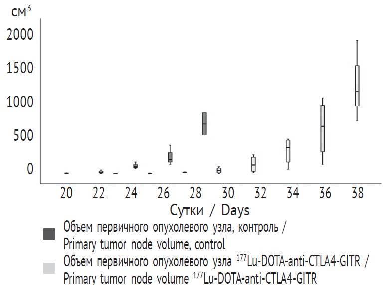 Inhibition of the latent period of neoplasm development with the use of the test drug contributed significantly to a later and slower increase of the tumor node. The inhibition of tumor growth was more pronounced during the course application of 177Lu-DOTA-anti-CTLA4-GITR compared to its single administration to experimental animals.