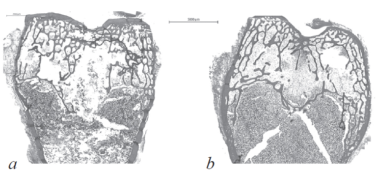 Fig. 2. The area of the epimetaphysis of the left femur, hematoxylin-eosin staining, digitized preparation: a — preparation of group 3; b — preparation of group 4