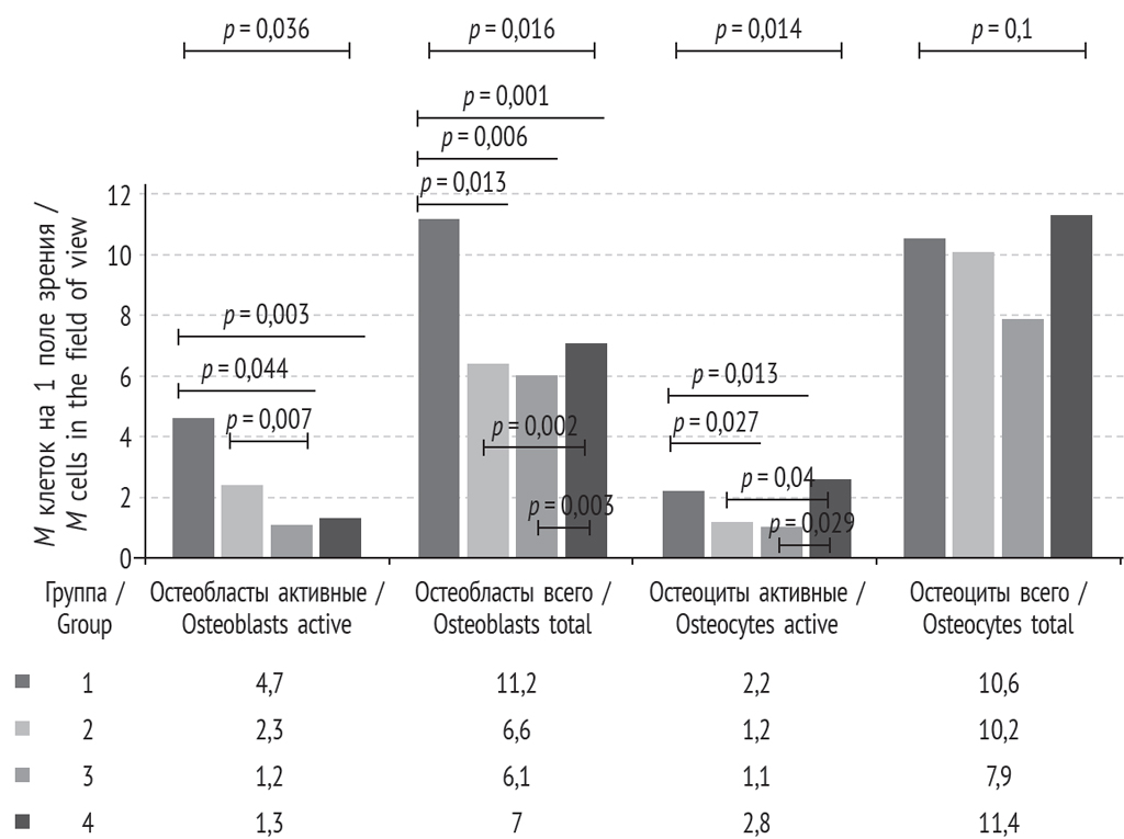 RESULTS: The following features were revealed in intact samples of different groups: group 1 — the minimum area of bone tissue and the thickness of the beams, the maximum number of osteoblasts, including active ones, the average number of osteocytes; groups 2 and 3 — average values of the area and thickness of bone beams, the average number of osteoblasts, the pool of osteocytes is represented mainly by inactive cells; groups 3 and 4 the minimum value of active osteoblasts; group 4 — the maximum thickness of the bone beams, a greater total number of osteoblasts and osteocytes. No osteoclasts were found in any group.
