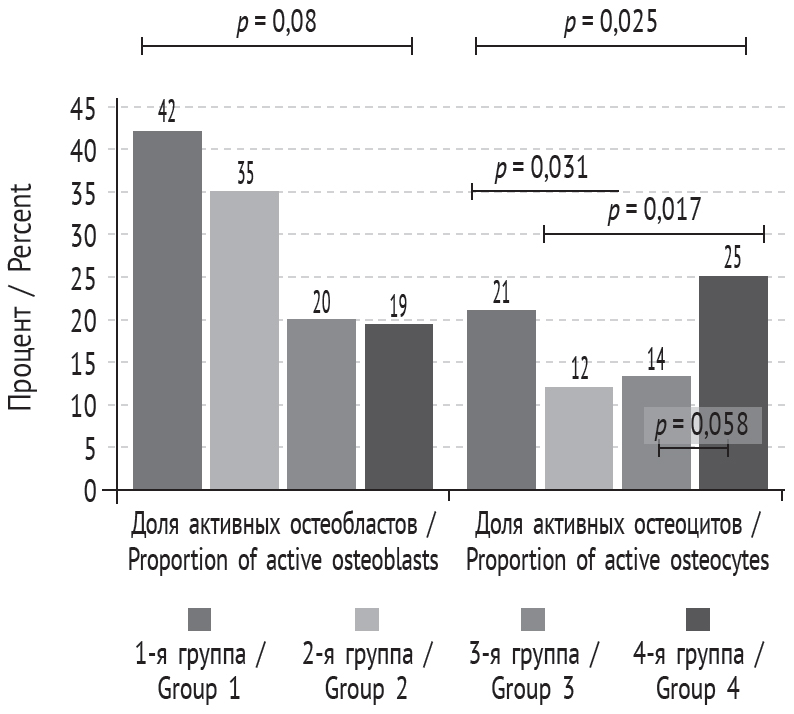 Медианные значения исследуемых показателей для всех препаратов составили (Me [Q25; Q75]): площадь костной ткани — 24,0 [18, 0; 29, 0] %, толщина костных балок — 117,8 [106, 3; 122, 8] мкм, число остеобластов — 6,8 [6, 5; 11, 2], остеоцитов — 10,4 [9, 6; 11, 4]. Доля активных остеобластов составляет 0,3 [0, 2; 0, 4] % от клеток эндостальной зоны, доля активных остеоцитов от общего количества остеоцитов — 0,2 [0, 1; 0, 2]%. Остеокласты не обнаружены ни в одном из препаратов. Разброс данных клеточного состава препаратов в разных группах проиллюстрирован на рис. 4.