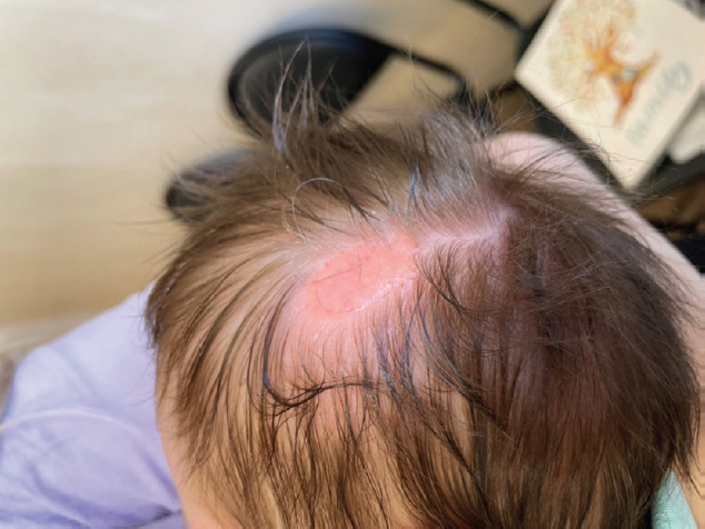 Рис. 1. Невус сальных желез, очаг без волос округлой формы, желтоватого цвета в области волосистой части головы у грудного ребенка