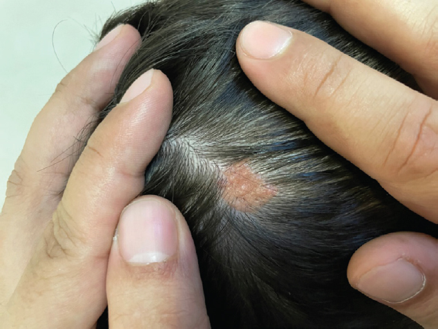 Fig. 2. Nevus of the sebaceous glands, oval, protruding, orange-colored plaque with a granular surface on the scalp