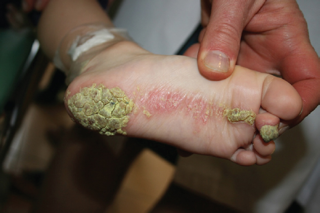 Рис. 5. Эпидермальный невус на подошве, гиперкератотические папулы, расположенные по линиям Блашко