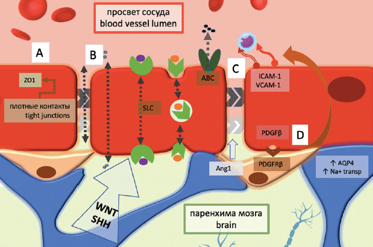 При том что проницаемость ГЭБ определяется в первую очередь свойствами эндотелиоцитов, регулирование этого процесса происходит посредством перицитов и астроцитов (рис. 1, часть B). Проведенные генетические исследования ГЭБ продемонстрировали активность WNT-b-катенинового (Wingless) и SHH-сигнального (SonicHedgehog) путей [5, 8, 14]. Через данные сигнальные пути перициты и астроциты регулируют функциональное состояние и экспрессию соединительных и транспортных белков в эндотелии, тем самым корректируя трансклеточный и парацеллюлярный транспорт, поддерживая гомеостаз центральной нервной системы.