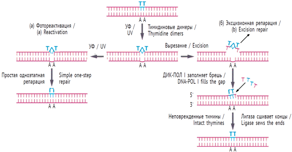 Рис. 1. Механизмы репарации повреждений в ДНК, вызванных УФ-излучением [22]