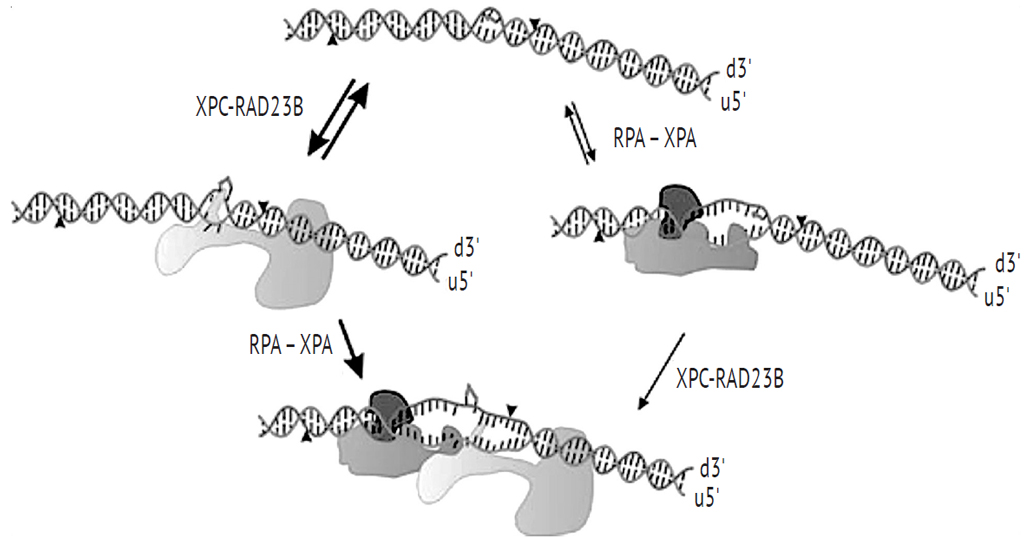 Fig. 2. Recognition of bulky adduct-DNA damage. Bulky DNA adducts distort DNA structure and initial binding by XPC-RAD23B (light grey) is potentially accompanied by insertion of a beta-hairpin between the strands of the duplex. Similarly, if the RPA-XPA complex (dark grey) encounters a damaged DNA, localized unwinding occurs inducing a greater distortion in the duplex. These potential pathways converge with the addition of second protein complex recognizing the greater distortion of the duplex. The position of cleavage is indicated by the carats and the position of the DNA adduct is depicted in grey on the damaged strand. The damaged strand is denoted with the “d” and the undamaged strand with the “u”. The orientation is denoted for each strand of the duplex [21]
