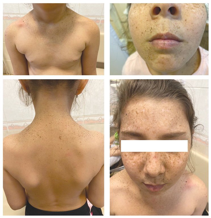 Пациентка, 8 лет, из Махачкалы. Поступила в кожную клинику СПбГПМУ в декабре 2020 г. Из анамнеза известно: больна с 2 мес., появились изменения на коже — на местах, куда попадало солнце, отмечалось покраснение и появление пузырей. В дальнейшем воспалительные изменения разрешились, осталась пигментация. Отмечались солнечные ожоги роговицы. В более позднем возрасте высыпания после воздействия солнца стали менее выраженными. Пигментация на местах высыпаний стабильна. В настоящее время новых высыпаний практически не появляется, так как ребенок не бывает на солнце. Наследственность не отягощена.