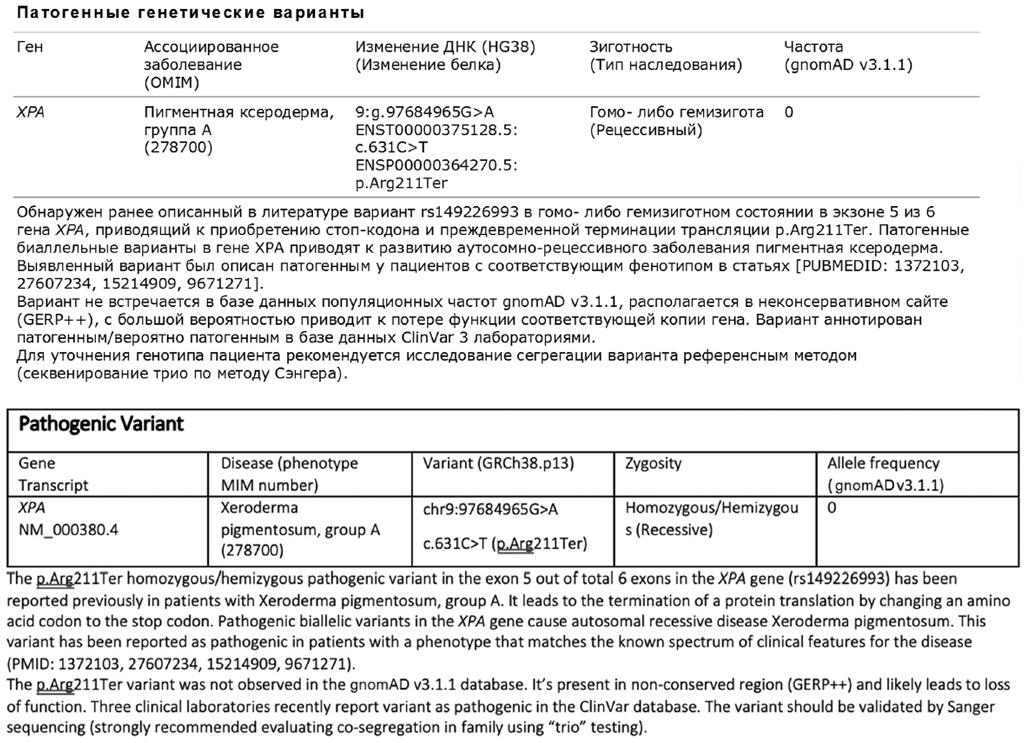 Методом выбора генетической диагностики стало полное секвенирование экзома. ДНК для анализа было выделено из гистологических блоков, приготовленных из биопсийного материала ткани пораженных участков кожи. По результатам секвенирования был выявлен только один патогенный NGS-вариант в гемизиготном состоянии в гене XPA (рис. 4). Учитывая характерную клиническую картину, обнаруженный вариант в одном из предполагаемых генах, отсутствие молекулярных дефектов в других генах, результаты NGS впоследствии не подтверждались референсным методом и считались подтверждающими генетический диагноз.