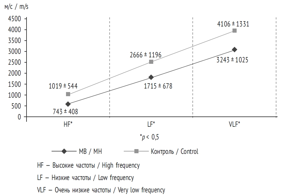 Далее мы сравнили показатели ВРС у лиц с МВ и в контрольной группе (0–2 КП). Результаты анализа спектральных показателей ВРС представлены на рис. 1.
