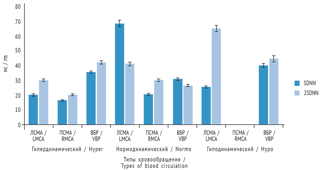 Fig. 1. Change in heart rate variability (SDNN) in patients with stroke on the 1st and 7th days of the study depending on the localisation of ischemic lesions and the type of blood circulation, LMCA is the pool of the left middle cerebral artery, RMCA is the pool of the right middle cerebral artery, VBP is the vertebro-basilar pool, SDNN is the standard deviation of NN-intervals on the 1st day of the study, 2SDNN is the standard deviation of NN-intervals on the 7th day of the study, ms – millisecond