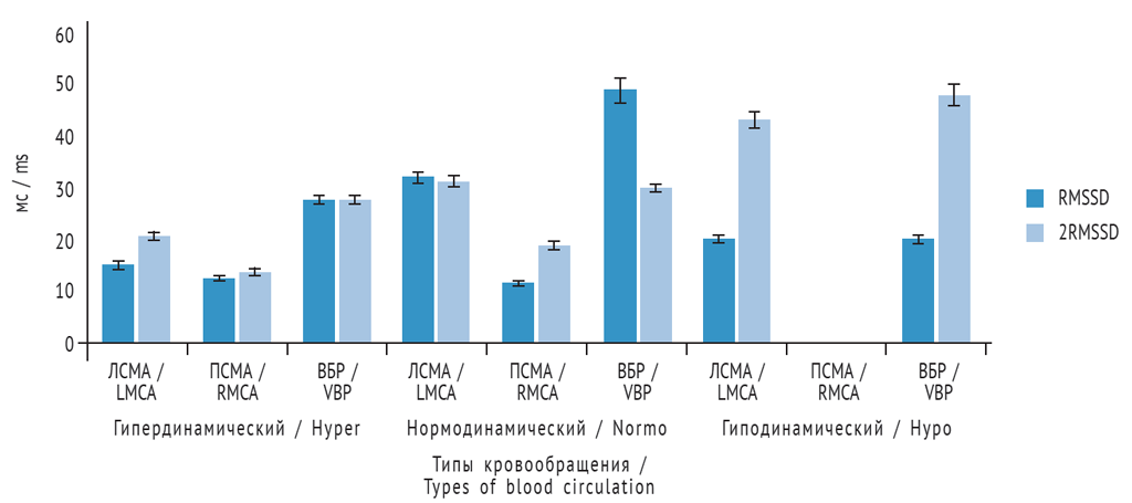 Fig. 2. Changes in heart rate variability (RMSSD) in patients with stroke on the 1st and 7th day of the study, depending on the location of ischemic lesions and the type of blood circulation, LMCA is the pool of the left middle cerebral artery, RMCA is the pool of the right middle cerebral artery, VBP is the vertebro-basilar pool, RMSSD mean square difference between the duration of adjacent RR-intervals in the 1st day of the study, 2RMSSD mean square difference between the duration of adjacent RR-intervals on the 7th day of the study, ms – millisecond