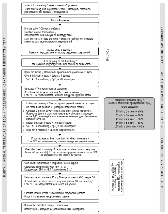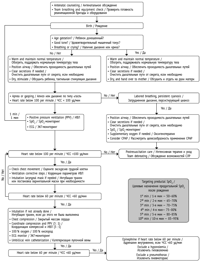 Рис. 2. Сердечно-легочная реанимация новорожденных в родильном зале (рекомендации Европейского совета по реанимации, 2015)