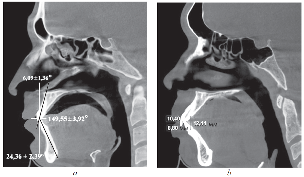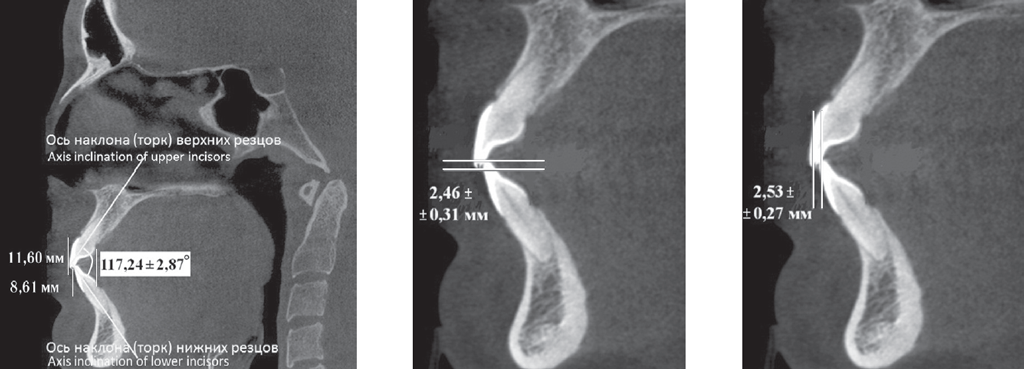 На томограммах определяли величину перекрытия зубов в вертикальном и сагиттальном направлениях. При измерении сагиттального перекрытия проводили вертикальные линии через режущий край резцов, перпендикулярно окклюзионной плоскости.