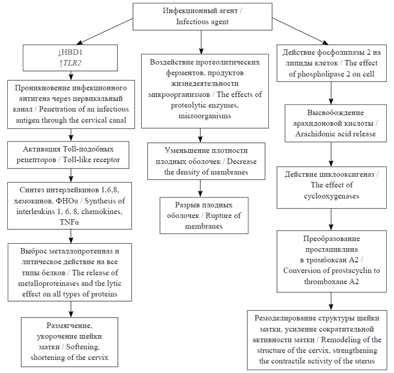Следующий механизм развивается вследствие непосредственного действия бактерий собственной фосфолипазой на липиды поверхностных мембран инфицированных клеток. Фосфолипаза А2 высвобождает из липидов клеточных мембран арахидоновую кислоту (АК). Арахидоновая кислота — ненасыщенная жирная кислота, являющаяся основным предшественником и источником синтеза в организме простагландинов. Изменение уровня АК в крови, матке и других тканях ведет к нарушению синтеза и содержания простагландинов. Арахидоновая кислота под действием циклооксигеназ преобразуется последовательно в простациклин (ПГ I2), тромбоксан А2, простагландины (F2a, Е2, D2 и др.) [3]. В процессе ПР концентрация простагландинов F2α и Е в амниотической жидкости скачкообразно возрастает вместе с резким увеличением в ней уровня АК, которая высвобождается из хорионического эпителия и оболочек плода и быстро превращается в них в простагландины (преимущественно в Е2), что и вызывает сокращения матки и роды [9]. В гладкомышечных клетках матки деполяризуются клеточные мембраны и высвобождаются ионы кальция, что приводит к активации киназы легкой цепи миозина, фосфорилированию миозина и взаимодействию фосфорилированного миозина и актина и в итоге — к сокращению мышц. В результате действия простагландинов на гладкие мышечные клетки шейки матки ее структура подвергается ремоделированию путем переориентации и изменения целостности коллагеновых волокон, в ней изменяется содержание воды, протеогликанов и гиалуроновой кислоты [6]. Усиливается также сократительная активность матки, развивается спазм сосудов и локальная ишемия тканей, что обусловливает болевой синдром и возможность развития ПР.