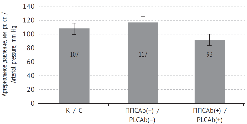 Fig. 1. The level of systolic blood pressure in the experimental groups. C — the first group of rats with a normal diet (control), PLCAb(–) – the second group of rats with preeclampsia-like condition, which were not injected with antibodies to MBG, PLCAb(+) – the third group of rats with preeclampsia-like condition, which were injected with antibodies to MBG