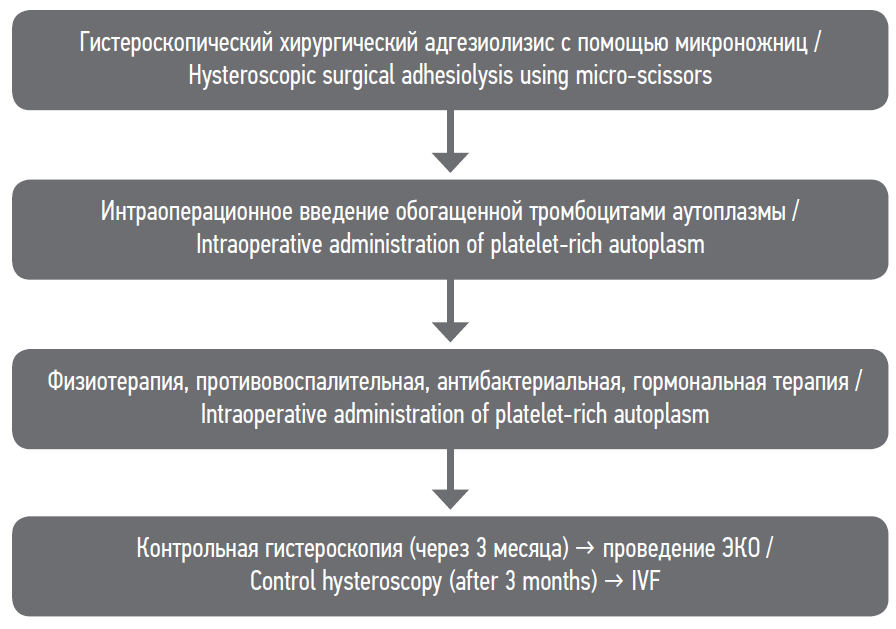 Методика АОТ-терапии: забор 400,0 мл цельной крови → центрифугирование → с помощью плазмоэкстрактора отбор плазмы и тромбоцитов → центрифугирование → отбор концентрированных тромбоцитов (0,55–0,70 · 1011 в 50 мл) → хранение в специальном контейнере при температуре 20–24 °С (до 5 дней). Интраоперационно (при проведении гистероскопии) ОАТ в объеме 20 мл с помощью полужесткой иглы субэндометриально вводится в 14 точек стенок полости матки (0,2 мл на вкол), с последующим орошением 15 мл ОАТ полости матки.