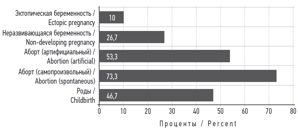 Паритет респонденток: роды были почти у половины (роды всего: 46,7 %; 14/30) женщин (из данной выборки у 16,7 % — преждевременные, у 83,3 % — своевременные); самопроизвольный выкидыш — у 16 женщин, неразвивающаяся беременность — у 8, артифициальные аборты — у 22 (рис. 2).