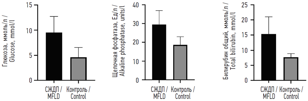В экспериментальной группе СЖДП отмечалось повышение уровня внутриклеточных ферментов: аспартатаминотрансферазы по сравнению с контролем (127,6 ± 8,8 против 101,4 ± 6,5 Ед/л; p < 0,05), аланинаминотрансферазы по сравнению с контролем (39,6 ± 1,5 против 33,3 ± 2,9 Ед/л; p < 0,05). О развившемся синдроме холестаза свидетельствует достоверное повышение уровня щелочной фосфатазы по сравнению с контролем (28,9 ± 2,3 против 18,2 ± 1,3 Ед/л; р = 0,0005). Регистрировалось также достоверное повышение уровня глюкозы по сравнению с контролем (9,4 ± 1 против 5,0 ± 0,4 ммоль/л; р < 0,0001) (рис. 1).