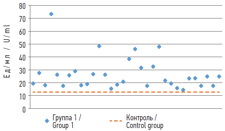 Рис. 1. Уровни аутоантител к нативной ДНК у детей в начальный период MIS-C