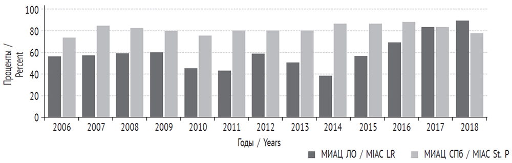 Fig. 1. The frequency of detection of intrauterine hypoxia and asphyxia as the cause of perinatal delivery of the fetus in 2006–2018. LRPB — Leningrad Regional Pathological Anatomical Bureau, MIAC St. P. and LR — Medical Information and Analytical Centers of St. Petersburg and the Leningrad Region