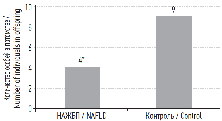 Fig. 3. Quantitative comparison of born individuals in offspring in experimental and control groups. *Difference from the “Control” group at the established detection level (р < 0.05). NAFLD — non-alcoholic fatty liver disease