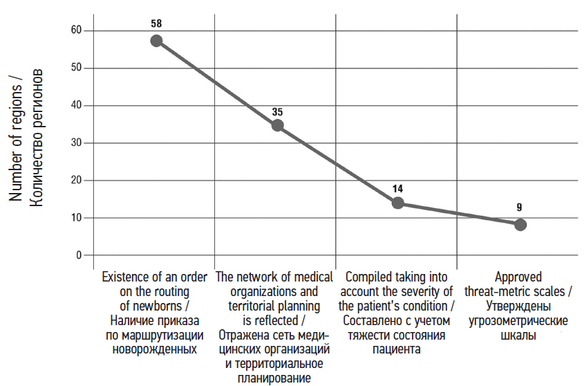 The organization of intraregional routing of newborns is based on the principles of territorial planning, considering the location of the network of medical organizations providing medical care in specialty and transportation time, staffing, available equipment, threat-metric principles for choosing a medical organization based on a nosological form and the patient’s condition severity at the time of transportation, and timely operational decisions. Moreover, a systematic approach plays a crucial role in establishing neonatological services, which improves the quality and availability of medical care, whereas medical, social, and economic effects are ensured owing to the rational distribution of forces and resources [2–4, 7, 10, 12].