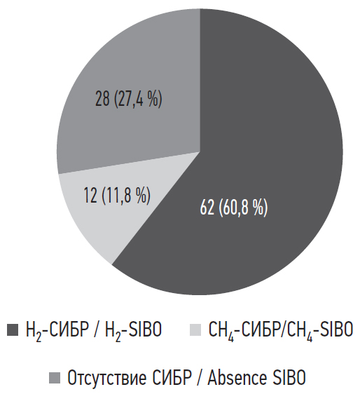 С помощью водородно-метанового дыхательного теста синдром избыточного бактериального роста различного характера диагностирован у 74 (72,6 %) обследованных пациентов с гастроэнтерологической и аллергической патологией, из них у 62 (60,8 %) установлен Н2-СИБР, у 12 (11,8 %) — СН4-СИБР (рис. 1).