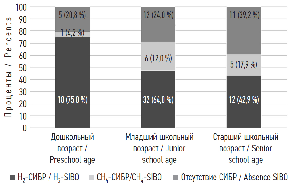 СИБР чаще диагностирован в младшей возрастной группе — у 19 (79,2 %) пациентов, с абсолютным доминированием Н2-СИБР у 18 (75,0 %). В более старших возрастных группах отмечалось снижение частоты СИБР с 38 (76,0 %) случаев в младшем школьном возрасте до 17 (60,8 %) в старшем. При этом наблюдалось изменение структуры СИБР с возрастом: увеличение частоты CН4-СИБР (с 4,2 до 17,9 %) и снижение частоты Н2-СИБР (с 75,0 до 42,9 %) с достоверной статистически значимой разницей между дошкольным и старшим школьным возрастом (p = 0,025).