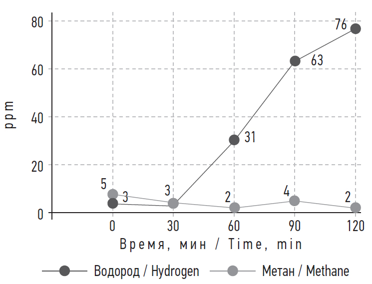 В табл. 2 представлен сравнительный анализ оценки уровня водорода в выдыхаемом воздухе, полученный с помощью двух разных газоанализаторов: медицинский диагностический прибор «Лактофан» и прибор для водородно-метанового дыхательного теста GastroCheckGastrolyzer.