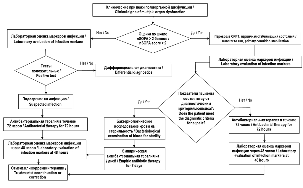 Neonatal sepsis is one of the most severe diseases of the neonatal period with a high probability of developing multiple organ dysfunction, septic shock and an unfavorable outcome. The purpose of this publication is to present draft federal clinical guidelines for the treatment of sepsis in newborns, which were developed taking into account the principles of evidence-based medicine. During the preparation of clinical guidelines, key questions were formulated using the PIPOH formula: P (population) — patient population and disease characteristics (neonate with sepsis and septic shock); I (interventions) — intensive care measures; P (professionals) — target audience of clinical recommendations (anesthesiologists, intensive care physicians, neonatologists, pediatricians, surgeons, infectious disease doctors); O (outcomes) — expected outcomes that can be improved (patient outcomes, health system indicators, epidemiological indicators, etc.); H (health care setting) — place of medical care (outpatient clinic, hospital, intensive care unit). The project includes sections on the etiology, pathogenesis and diagnosis of sepsis in newborns. Particular attention is paid to the issues of microbiological diagnostics, identification of the pathogen, antibacterial therapy, respiratory and nutritional support, extracorporeal hemocorrection, the use of intravenous immunoglobulins. It has been demonstrated that one of the mandatory elements of therapy is the early initiation of enteral nutrition using breast milk, the use of which is one of the most effective methods for the prevention of late sepsis in premature newborns with low and extremely low birth weight.