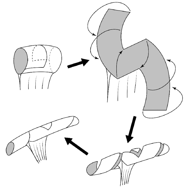 Наибольшее распространение получили способы LILT (longitudinal intestinal lengthening and tailoring — продольное удлинение кишечника) и STEP (serial transverse enteroplasty — последовательная поперечная энтеропластика) [17], причем отмечается тенденция к вытеснению первого способа вторым [21, 27], по-видимому, в связи с технической сложностью LILT и несмотря на менее рациональное использование имеющейся кишечной стенки при STEP. Несмотря на надежность и воспроизводимость данных методик, им свойственны технические ограничения, связанные с требованиями к исходной конфигурации кишечного сегмента [16, 20], в то время как альтернативные подходы к изменению конфигурации дилатированной кишки либо представлены небольшими сериями клинических наблюдений (SILT — spiral intestinal lengthening and tailoring, спиральное продольное удлинение [13], двуствольная энтеропластика [25], дуоденопластика поперечными лоскутами [8]), либо остаются лабораторными феноменами (дистракционный энтерогенез [15, 18, 23]) или теоретическими предложениями (формирование «спирального клапана» [24]). В связи с этим представляет интерес рассмотрение в контексте аутологической реконструктивной хирургии кишечника широко применяемой в урологии техники [9, 22, 28] — энтеропластики по способу Yang–Monti в модификации Casale [12]. Суть метода сводится к рассечению противобрыжеечного края сегмента тонкой кишки фигурным разрезом и повторной тубуляризации под углом к линии прикрепления брыжейки, в результате чего сегмент кишки приобретает большую длину и меньшую ширину (рис. 1).