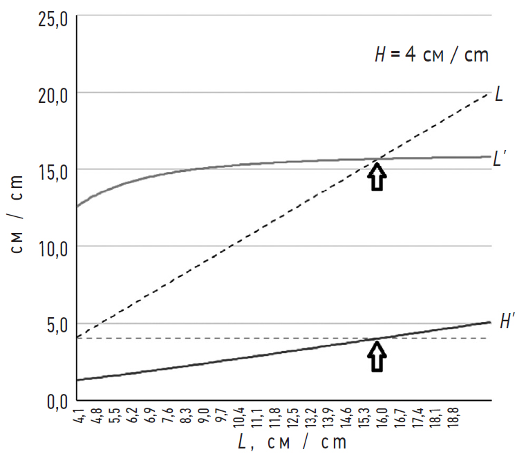 Рис. 3. Зависимость результирующих параметров сегмента кишки (L', H') от исходной длины (L) при константном значении ширины (H = 4 см). Энтеропластика эффективна (L' > L) при значениях L < 15,7 (Н × 3,92; отмечено стрелками)