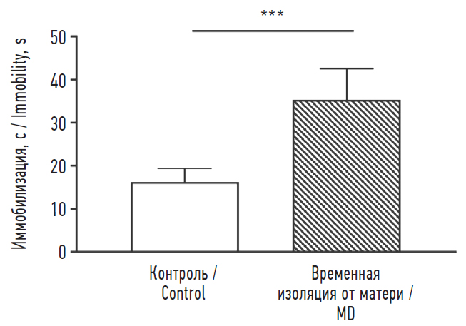 Рис. 1. Время иммобильности животных в тесте Порсолта после временной изоляции от матери в раннем онтогенезе. ***р <0,001 — достоверные отличия по сравнению с контрольной группой. Время иммобильности выражено в секундах; M±m.