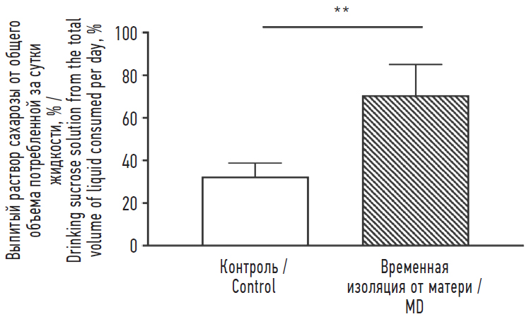 По результатам двухбутылочного теста на предпочтение сахарозы ранняя временная изоляция от матери приводит к развитию ангедонии (невозможность испытывать удовольствие). Подтверждением данного состояния было снижение предпочтения раствора сахарозы (56,33±2,73%, p <0,01) по сравнению с крысами из контрольной группы (75,67±2,35%) (рис. 2)