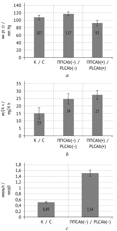 Рис. 1. Уровень систолического артериального давления (а), суточной протеинурии (b) и МБГ в плазме крови (c) в экспериментальных группах. К — группа крыс с обычной диетой (первая, контроль); ППСAb(–) — группа крыс с преэклампсия-подобным состоянием (вторая), которым не вводили антитела к МБГ; ППСAb(+) — группа крыс с преэклампсия-подобным состоянием, которым вводили антитела к МБГ (третья)