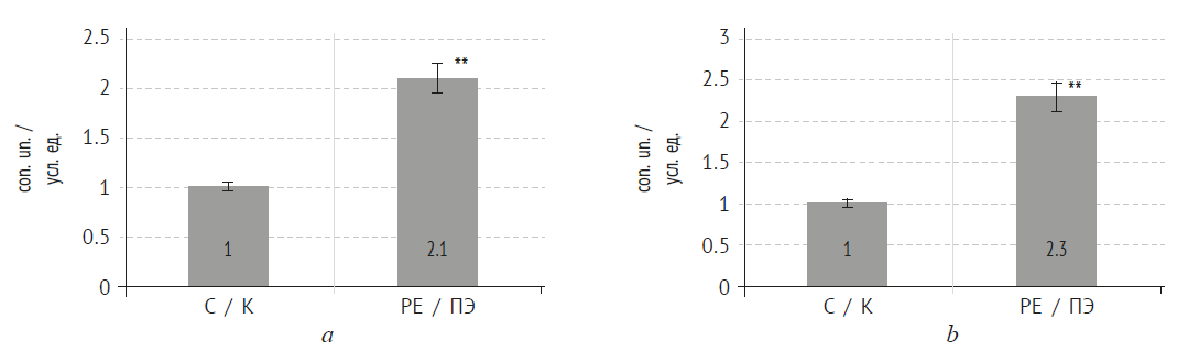 Рис. 3. Уровень содержания эндоглина-1 (a) и sFLT-1 (b) в плаценте обследованных групп пациенток. К — группа контроля, физиологическая беременность; ПЭ — основная группа, преэклампсия. ** Достоверные различия между группой К и ПЭ, р < 0,001