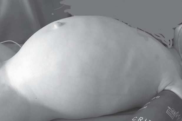 После выполнения высокого промывания толстой кишки отошло большое количество кашицеобразного стула и газов, живот уменьшился в размерах. Диагноз кишечной непроходимости был исключен. В последующие дни ребенок не срыгивал, питание усваивал, регулярно отходил самостоятельный стул. Выписан на амбулаторное лечение с диагнозом: гипоксически-ишемическое поражение ценральной нервной системы, вегето-висцеральный синдром. На 2-м месяце жизни появилась тенденция к задержке стула, которая нарастала в динамике. Ребенок наблюдался педиатром и ни разу не был осмотрен хирургом. В хирургический стационар поступил в возрасте 10 мес. с клиникой кишечной непроходимости (рис. 2).